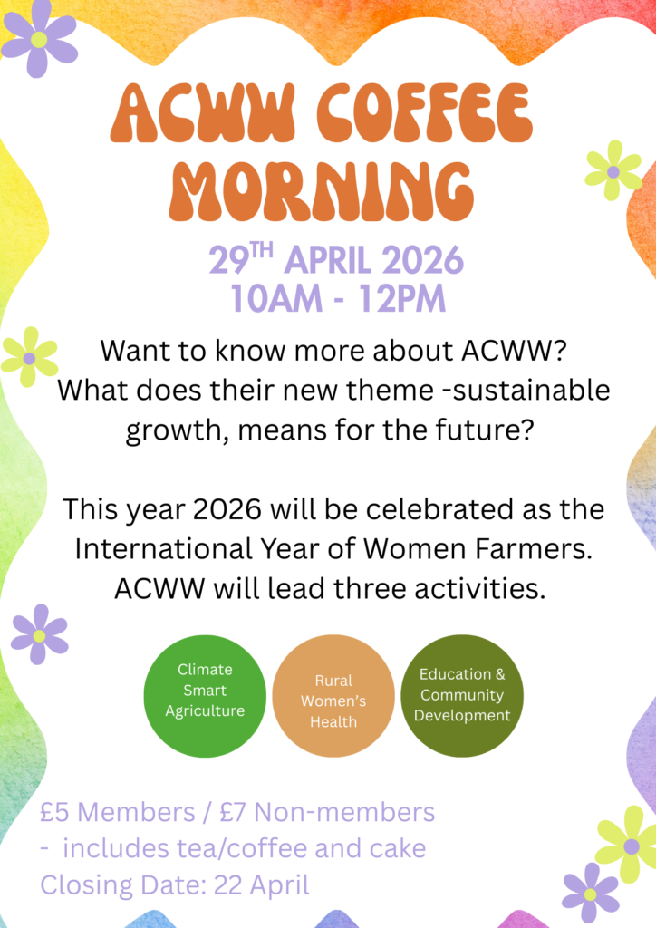 Join us for a Coffee Morning on Wednesday 29th April to learn more about the inspiring work of Associated Country Women of the World (ACWW) and discover their new theme.