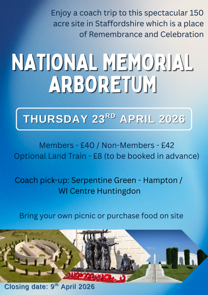 Coach trip to visit the spectacular 150 acre site of the National Memorial Arboretum in Staffordshire, on Thursday 23rd April 2026